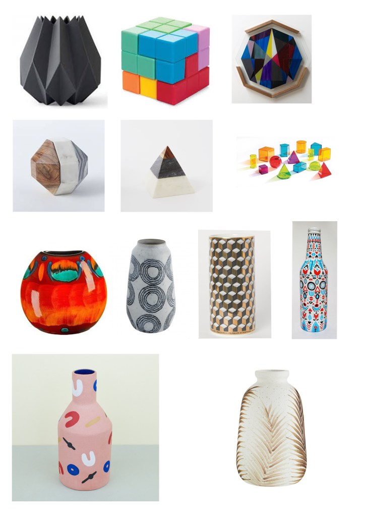 After looking in charity shops I found 3 objects to portray the right side of the brain, however did not find any objects finding to portray the left side of the brain. Therefore I looked on Amazon and also asked my group if they had any objects that would fit what I was looking for. I found 3 more objects on Amazon that fit in with the style of geometric patterns and dull colours. My group volunteered 2 objects, one reflecting each side of the brain. Therefore I had 8 objects in total.