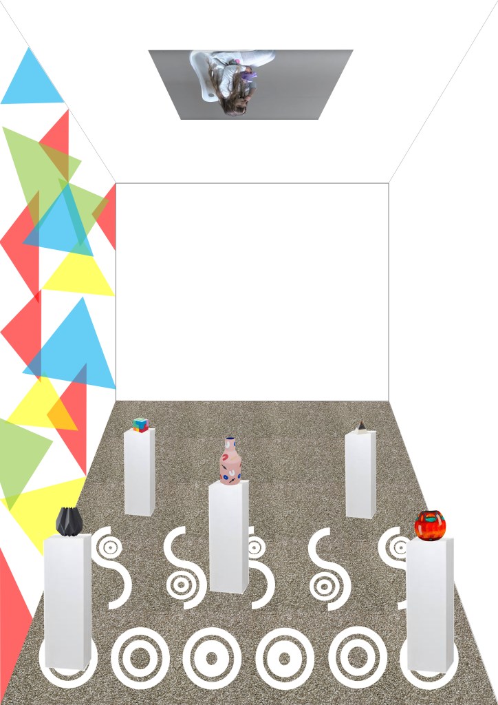 On the left window would be bright coloured cellophane that would be in the geometric shapes of triangles and rectangles. On the floor would be white circles and free flowing patterns that would contrast with the grey floor.