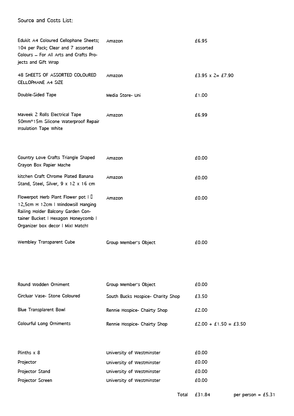 From Amazon I also ordered coloured cellophane to cover one side of the windows and white electrical tape to create patterns on the floor. Overall the spending came to around £31.84 which was £5.31 per person. That’s not a fixed value as there could be one or two things we need for the set-up, but will be around the budget.